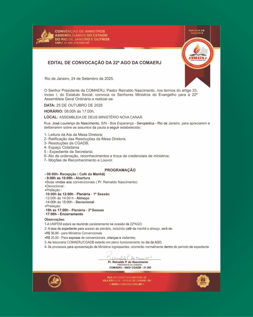 Participe da Convenção de Ministros Assembleianos do Estado do Rio de Janeiro e Outros e experimente um tempo de renovação espiritual e crescimento pessoal..