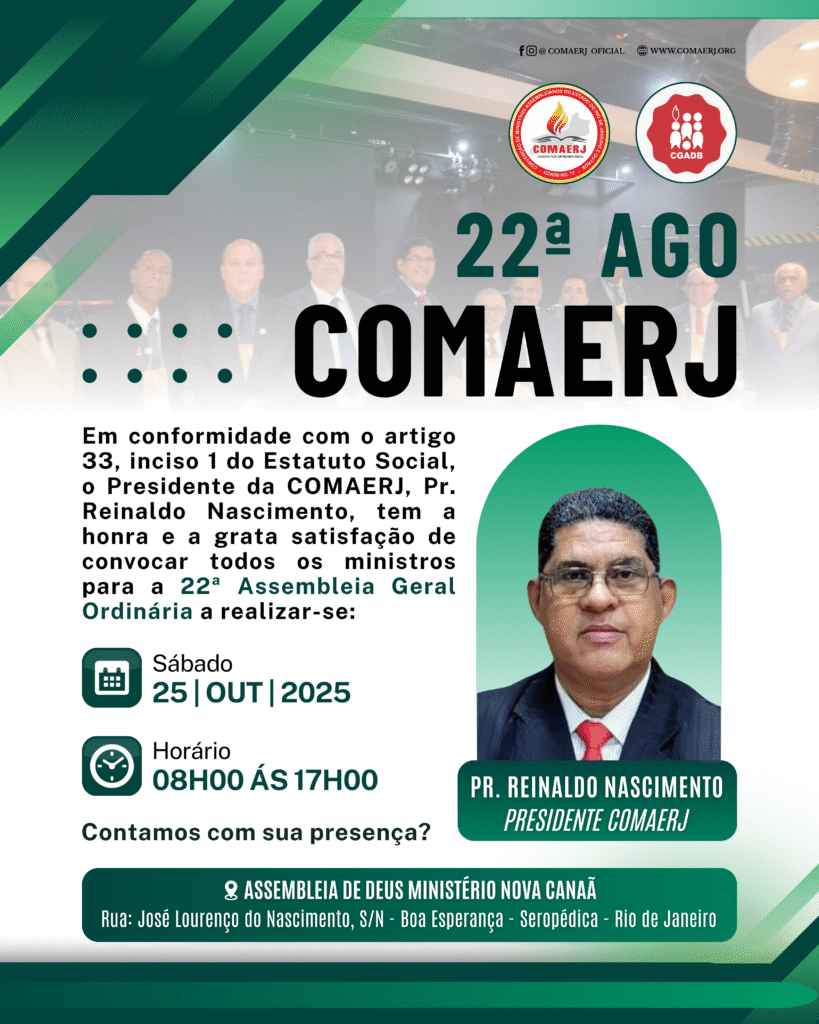 Considerando o teor do nosso lema, “UNIDOS POR UM MESMO IDEAL”, sirvam-se da COMAERJ para pertencerem a um colegiado coeso e reverente aos princípios do Reino de Deus.