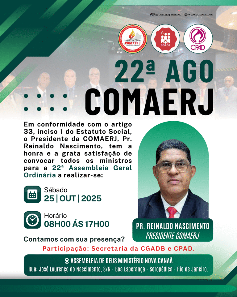 É com grande alegria e expectativa que damos as boas-vindas a todos à 22ª AGO COMAERJ que será realizada no dia 25 de outubro de 2025 com a participação da secretaria CGADB e CPAD.